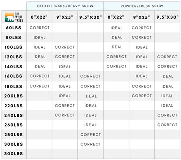 The size chart shown represents the ideal and correct total weight capacities according to the size of the snowshoe for our 3 models of The Wild Tribe snowshoes.